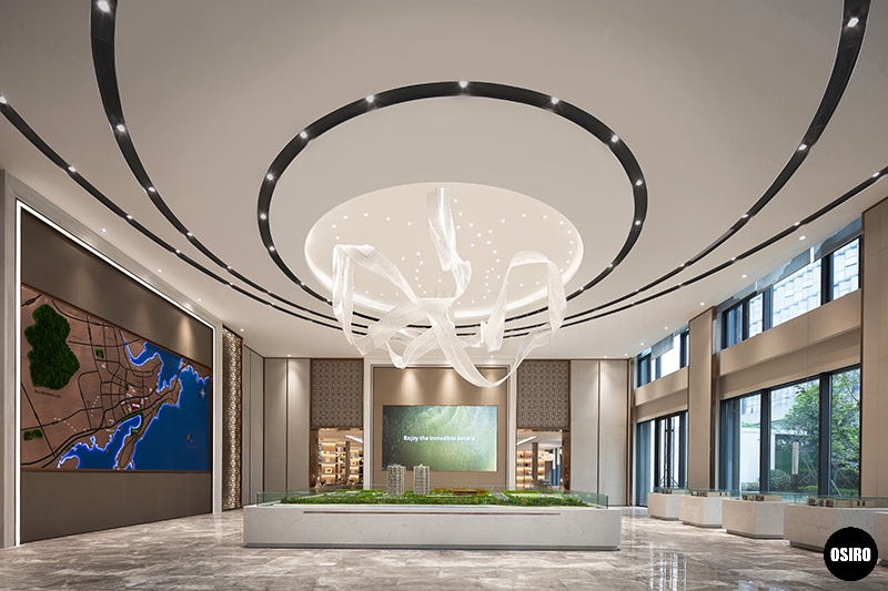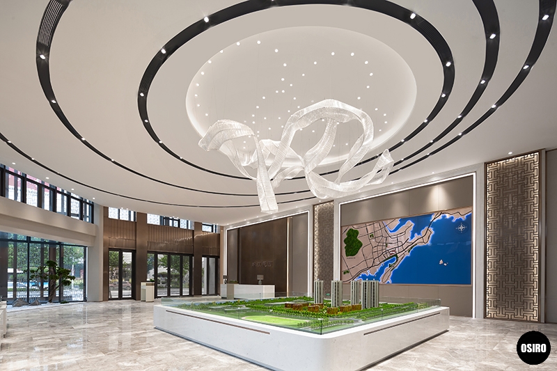 圆形的展示区宏伟端庄、气势恢弘,上方的东营吊灯设计灵感来源于涌动的海浪,居当临水,有水则灵,