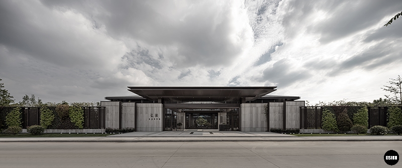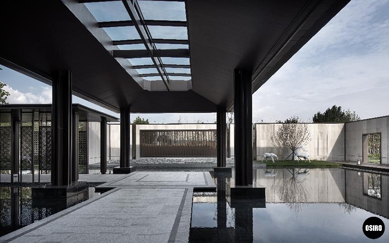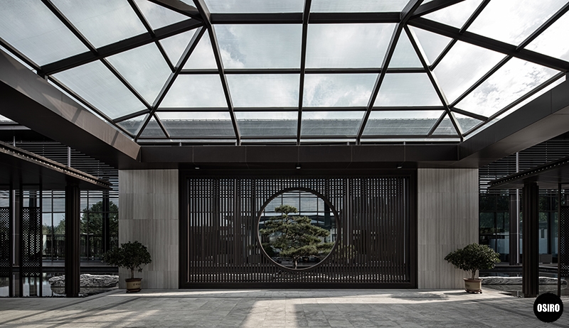 接待前厅上方采用唐代传统的屋顶元素,以现代手法进行重构,通过现代材质表现新中式融合风格,