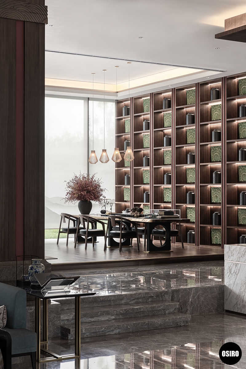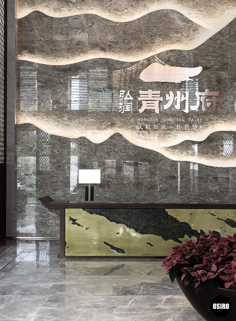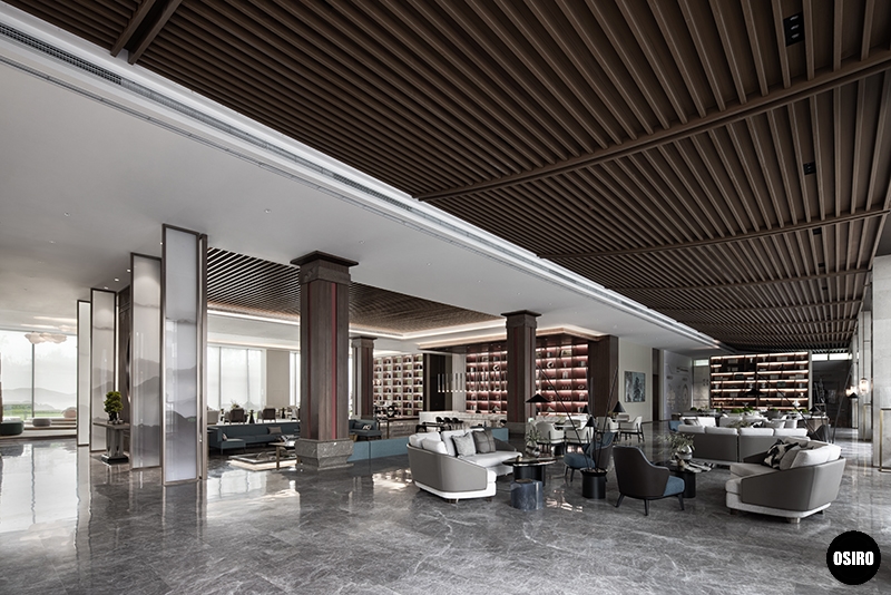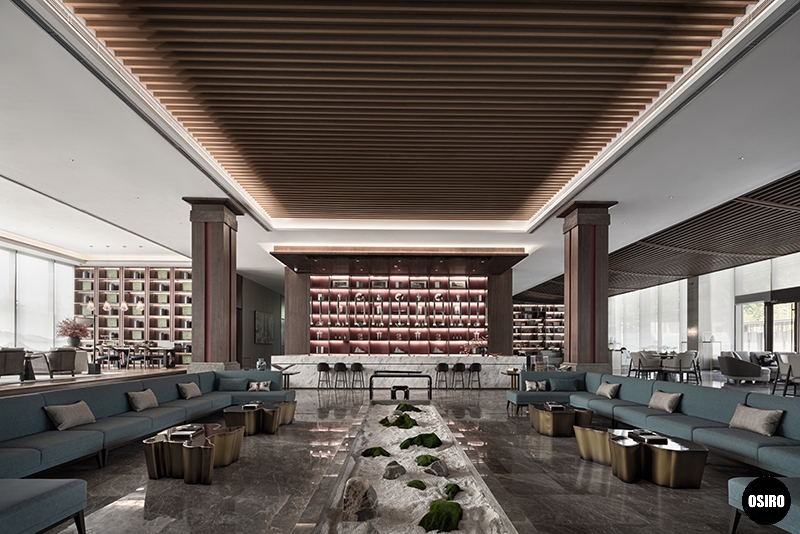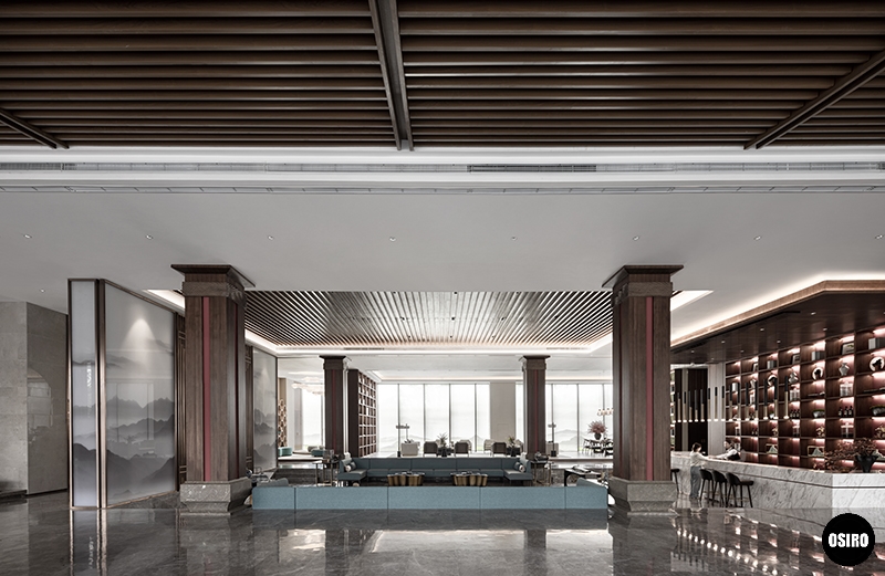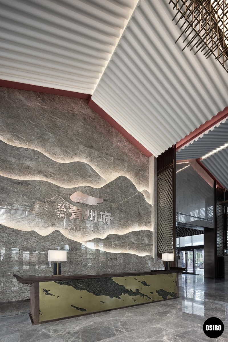 大堂的第一视觉借由整体的山形石材背景做铺垫,以东方屋脊吊灯承托空间的东方意境之美,隐喻