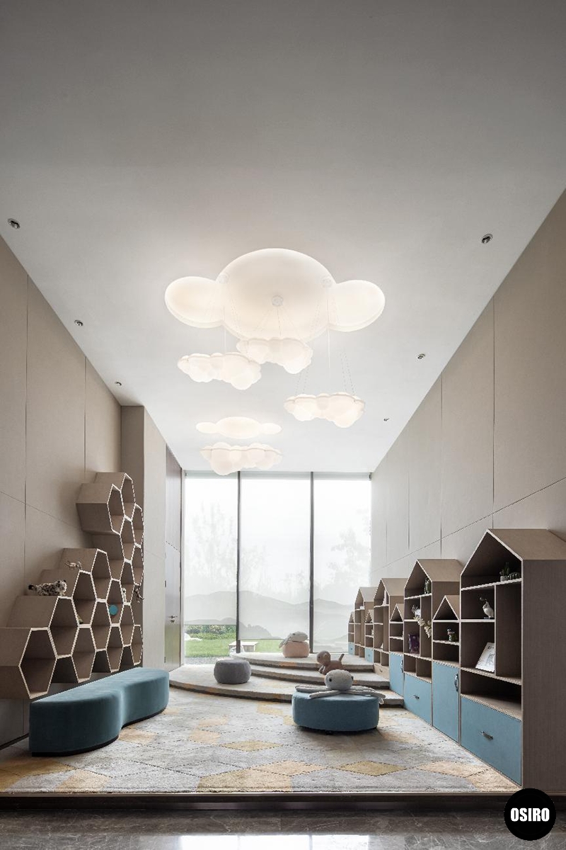 为儿童打造的游玩区,以色彩作为空间情感的絮语,云朵形灯具烘托出童真烂漫的空间趣味,同时以