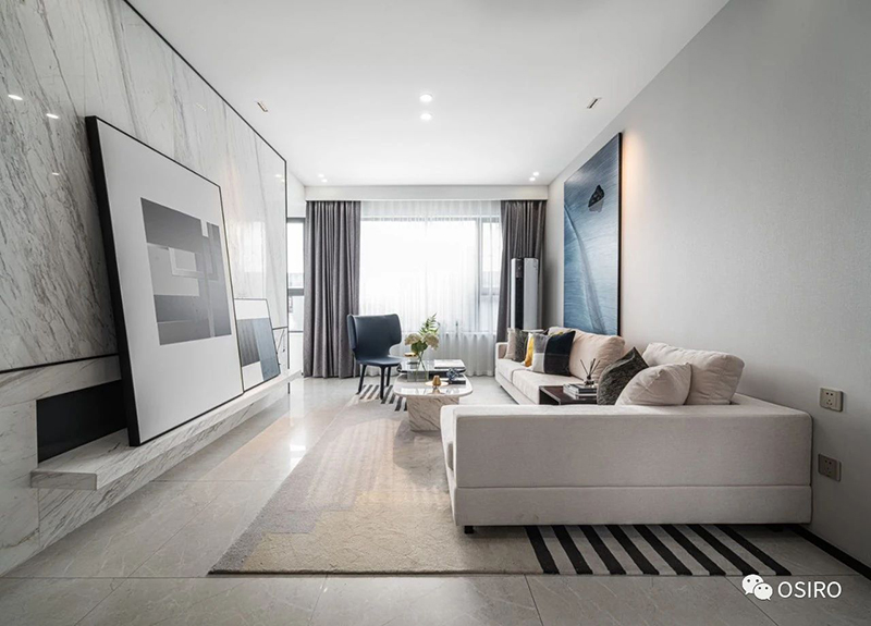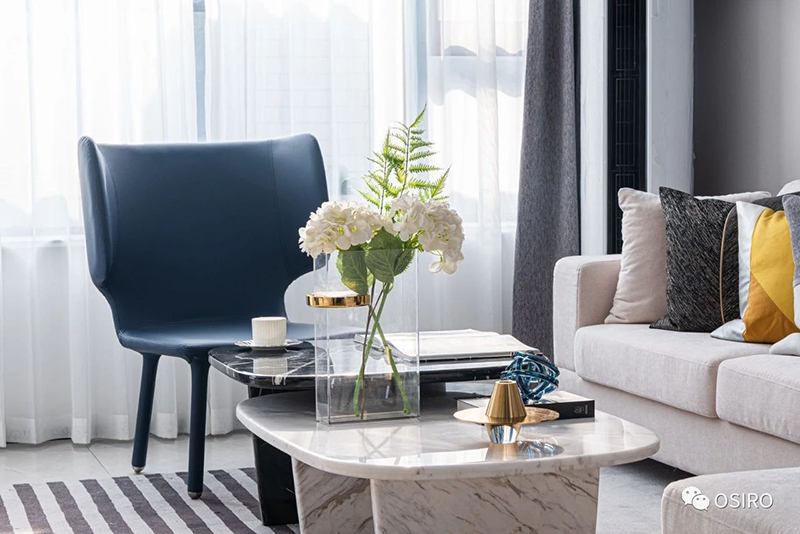 空间的舒适与硬朗,最大化的让感受回归细腻,蓝色充满灵动性,浅灰色的大理石背景墙加以