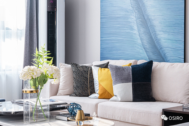 青岛东营买手店在家具的选款上简洁大方,在色彩上进行低明饱和度的对比。大胆的采用 大色块的装饰画,在场景营造的细节上进行巧妙地处理,增加了整体的丰富度及精致度。
