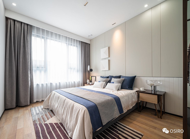 卧室,作为休憩的避风港,空间里用静谧的蓝色与舒缓的米色来组合成温暖如初、安静闲适的空间,