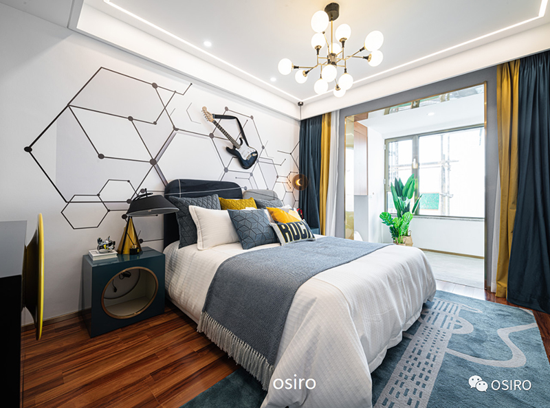 男孩房里灵动的音符线条与色彩相互交叠,伴随着吉他弹奏的律动,为音乐宠儿的男孩筑造了