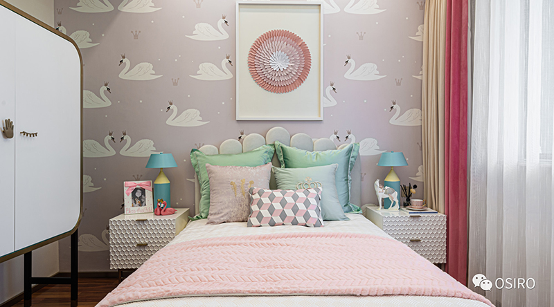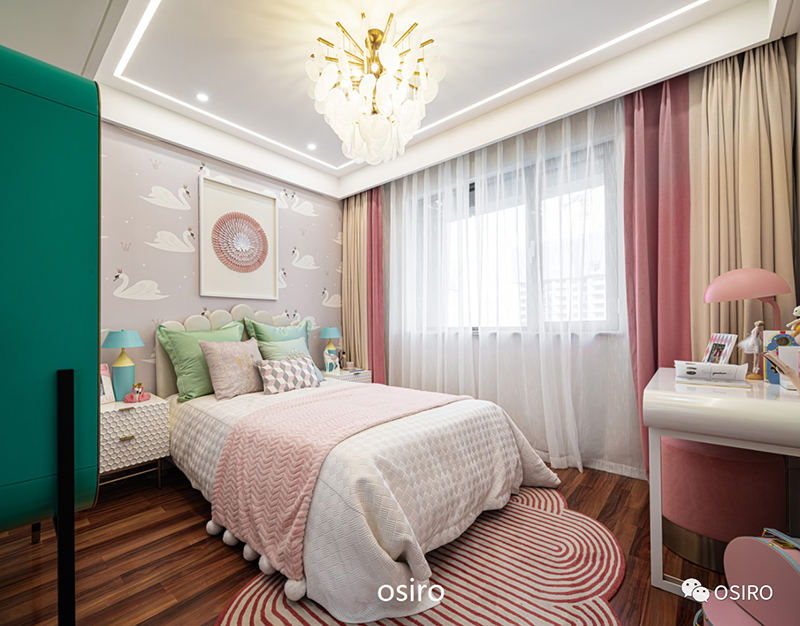 舞蹈主题的女孩房搭配粉色与鸭蛋青作为空间点缀色,呈现不一样的可爱俏皮气息,
