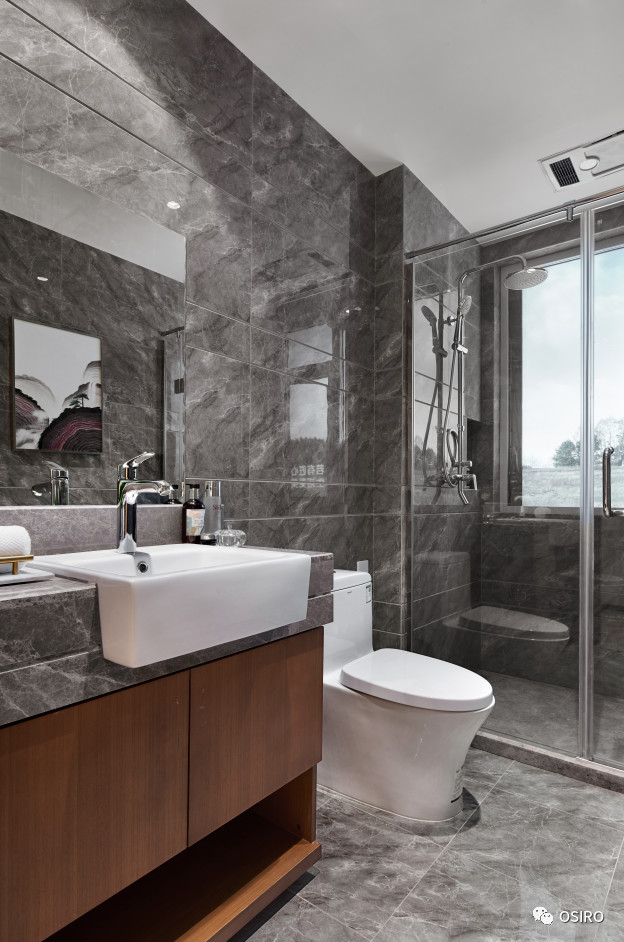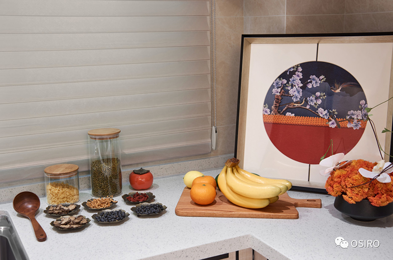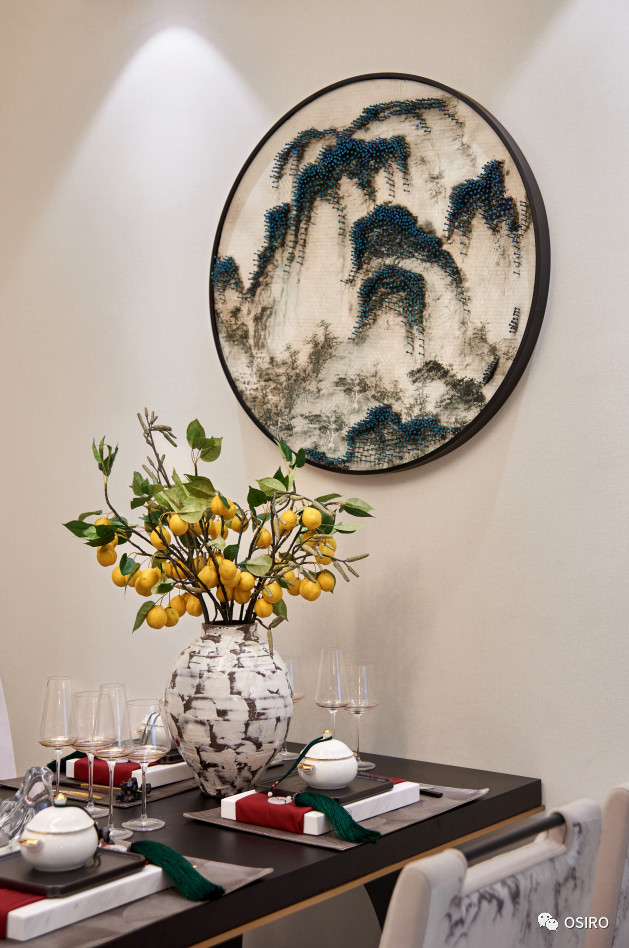 餐厅的一桌一椅,均凝聚着空间的形与神。写意山水画面料和深木色撞色餐椅,唤醒餐厅的活力。