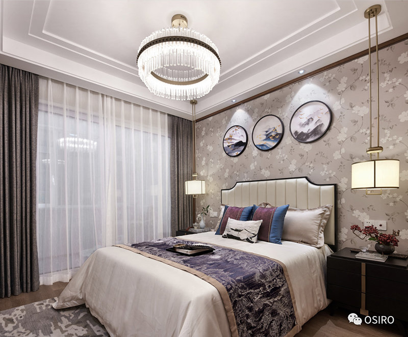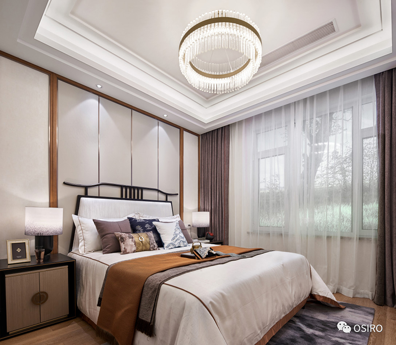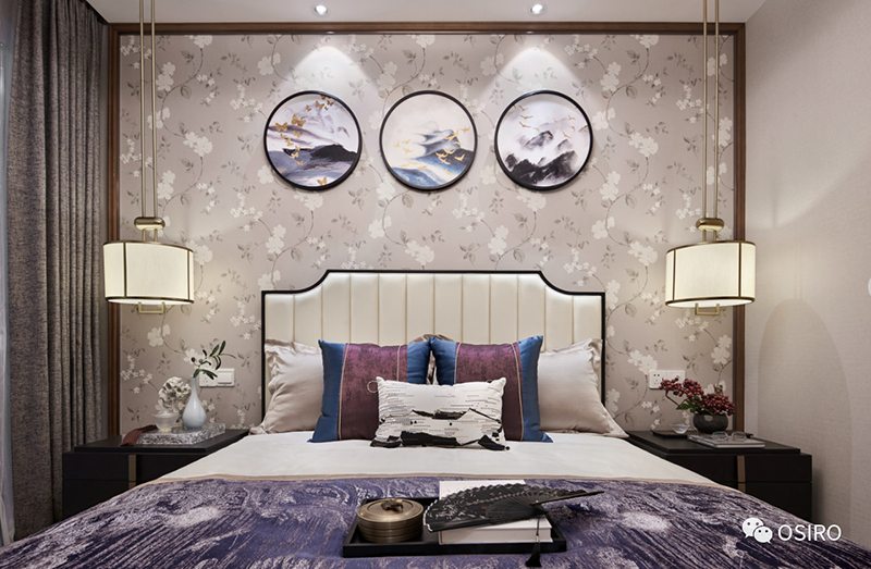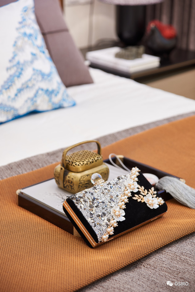 布艺的设计增添品质感,床搭上的手炉、山水纹理的靠包及造型独特的台灯皆烘托文化气息。