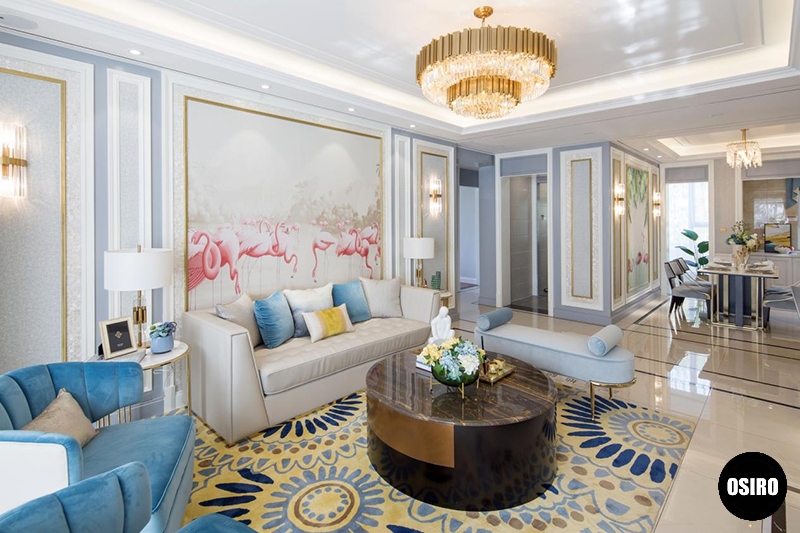 色彩运用上,客餐厅精选静谧蓝、高贵金为主色调,点缀火烈鸟红,形成淡雅与尊贵的视觉冲击。