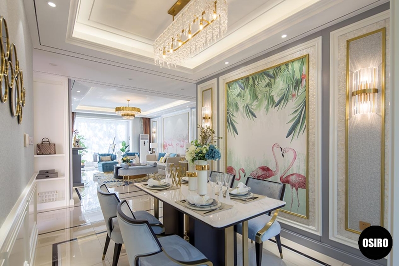 青岛家居配饰家具与挂画的选择上,消弭了传统法式的视觉繁累,更多雅致奢华美态。