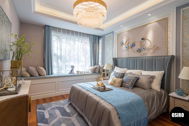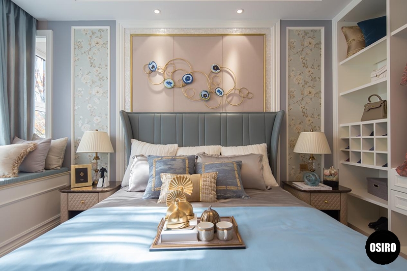 主卧的配饰灵感,青岛东营空间设计静谧蓝、金色、黄色不间断地跃入眼帘,摩登又不失温馨。