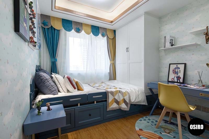 蓝色与黄色的搭配相辅相成,完成了对空间氛围的营造,趣味十足。