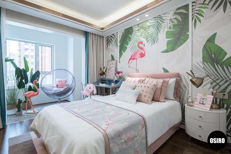 青岛家居配饰设计师以趣意十足的火烈鸟壁纸、透明摇椅、火烈鸟玩偶,