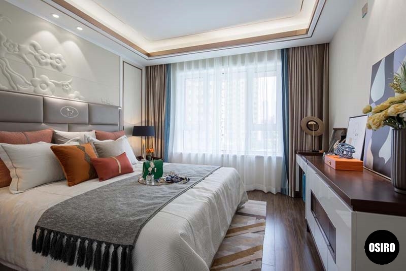 主卧的格调在柔和的设色中铺叙开来,舒适亲肤的床品、简单大方的装饰,