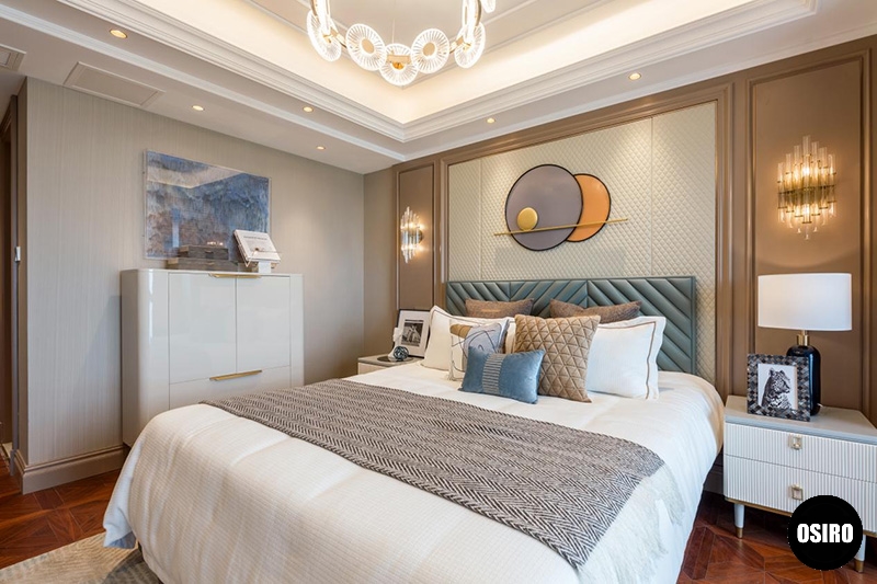 蓝色被打破运用到各个空间,灰蓝色的床头,床品,配饰,