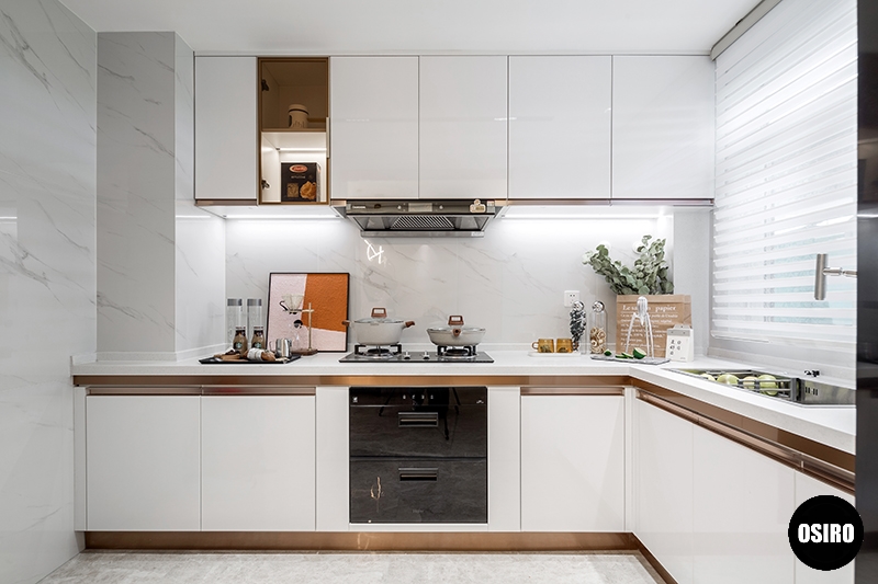 厨房洗切炒分布合理,整体设计为清新雅致的米色调,干净整洁,