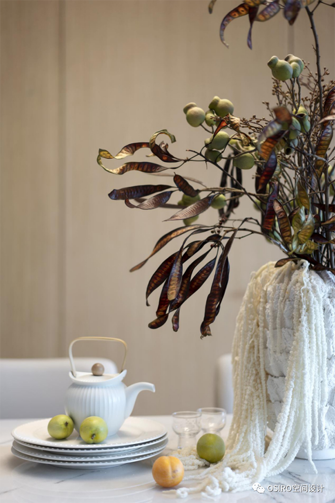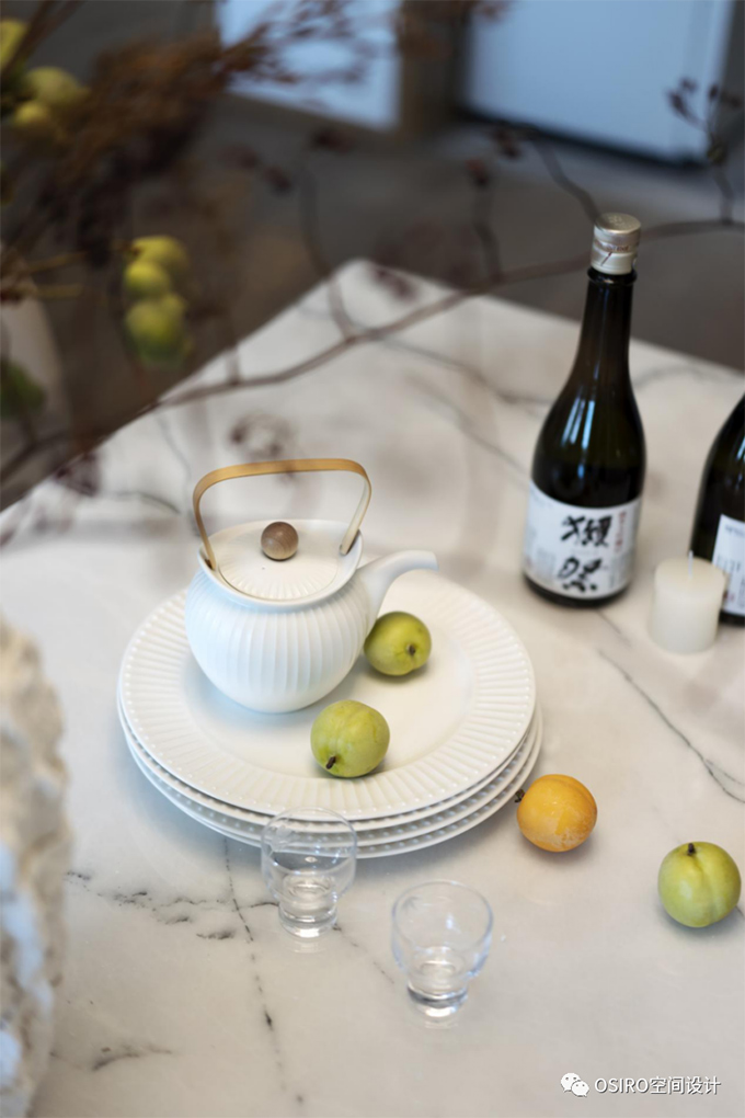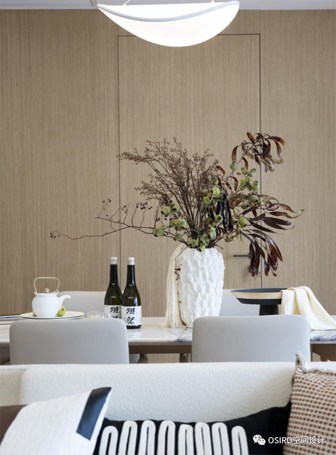 餐厅延续着素雅的色调。既统一了主体空间的视觉效果,又于功能上实现了日常生活的状态。静坐时光,聆听岁月,马不停蹄地在忙碌中追求生活的真谛,蓦然回首间,终被家的一隅温柔安放。