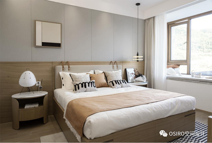 采光极好的主卧,以大面积落地玻璃移门接纳着自然光的进入。以沉稳朴实为基调打造宁静致远的诗意生活,大面积落地窗纳入山清水秀的美景。