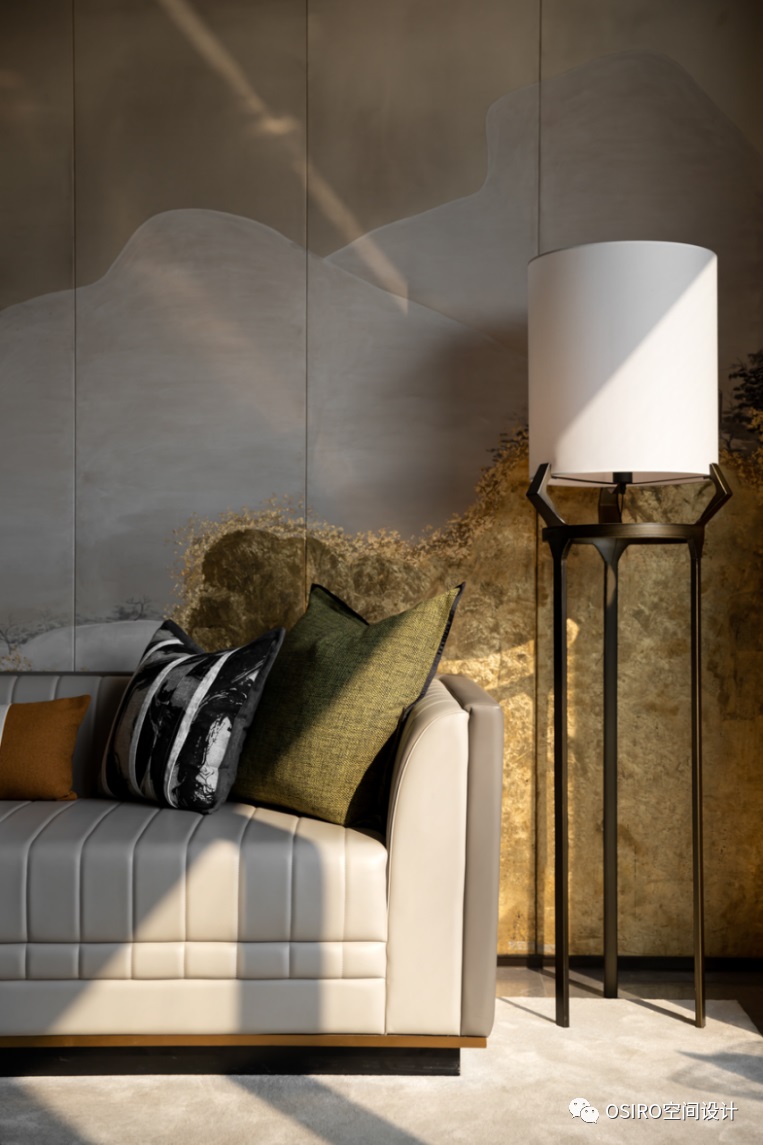 东营地毯,呼应背景墙的山水壁画,线条与朦胧的意象玩味出古代文人心中的禅意美。卧谷听松,主人的情怀亦在此处呈现。