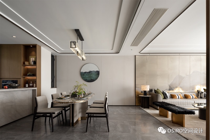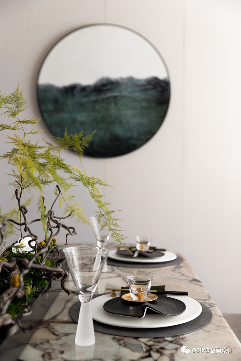餐厅墙面的装饰画,远看东方近看无,喧嚣中的缄默,繁华里的无华,同时也是取”团圆”“圆满”之意,表达了国人对美好圆满生活的向往。
