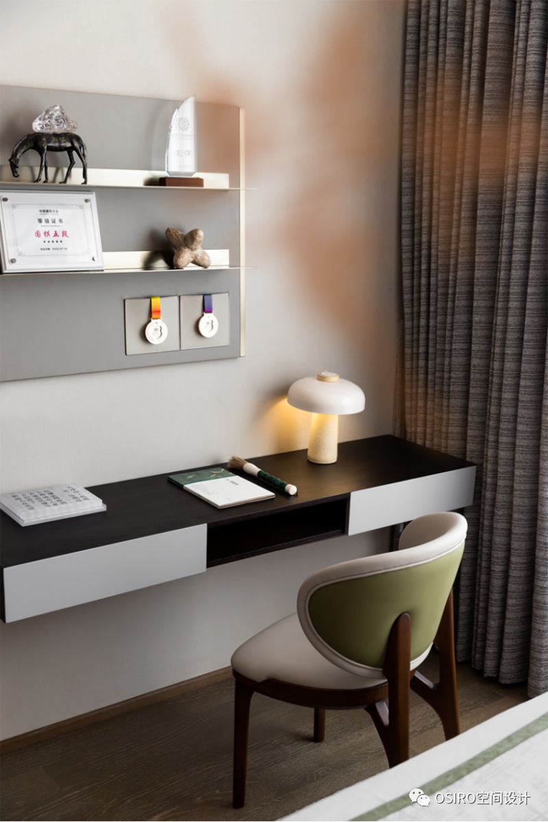 以围棋少年作为概念衍生,去体现儒学世家的爱好。床以宋代的官帽为灵感设计,床头造型如同一根又平又長的「翅」,为整个空间带来充满韵味且艺术文雅的气质。