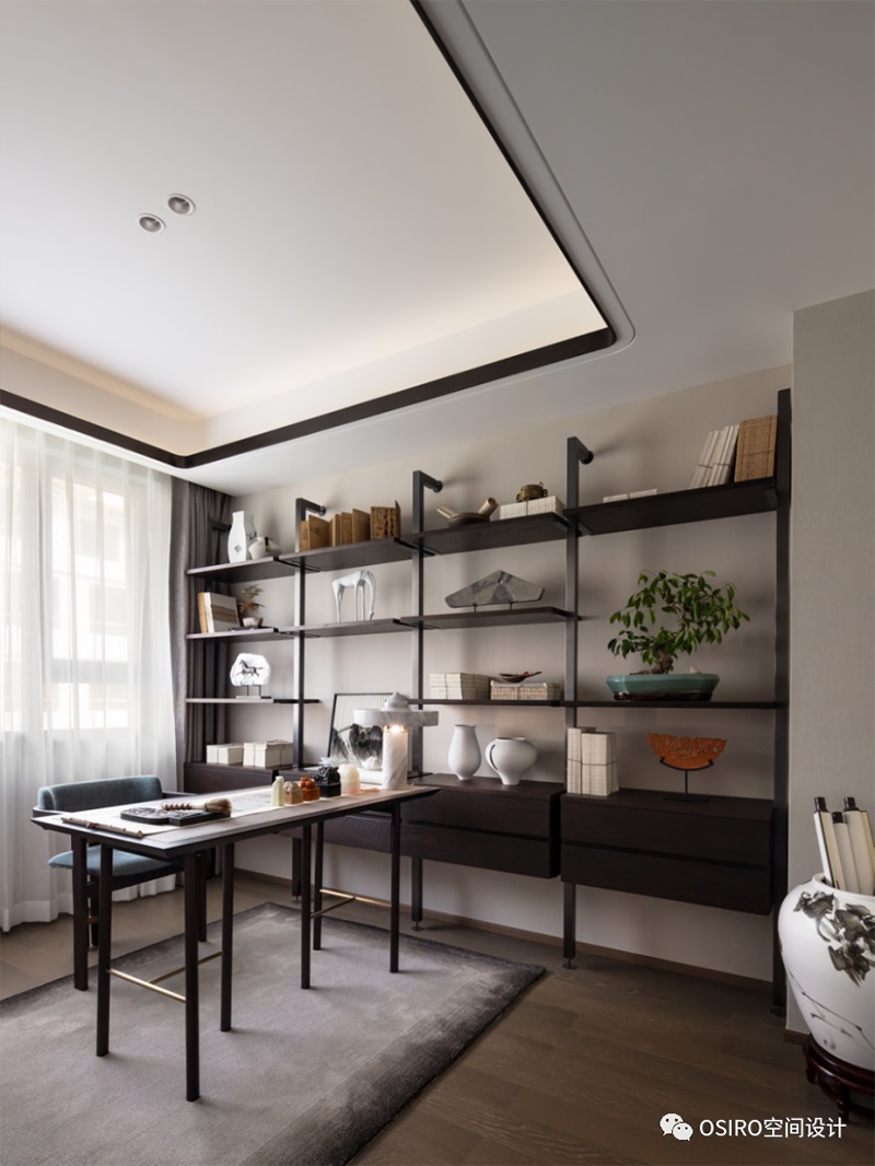 书房作为寄托闲情逸趣的空间,自始至终营造着独具魅力的一片天地,在黑白水墨色的基调下,加入一抹绿色得盆景,文人的古韵风情和东方沉淀即刻凸显出来。