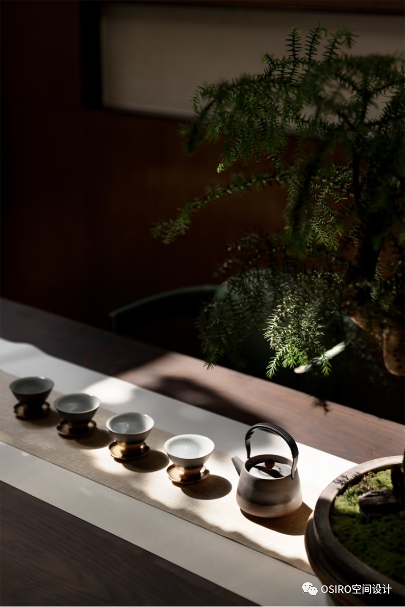 门外是人间烟火,门内是闲逸雅致。茶区以听琴图为为灵感,直接入眼的是苍劲有力,自上而下的迎客松,一方茶席二三茶具,宁静致远,燃一线香沏一壶茶,不经意间刻画出的东方生活美学。