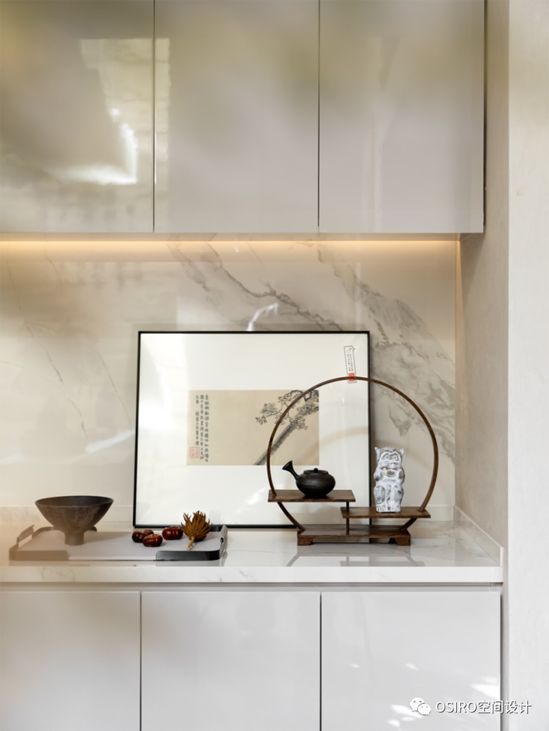 西厨岛台适时划分出厨房与就餐处,整个空间不至单调,行走动线也保持流畅。居者在准备食材时,还能和家人亲密共叙日常。