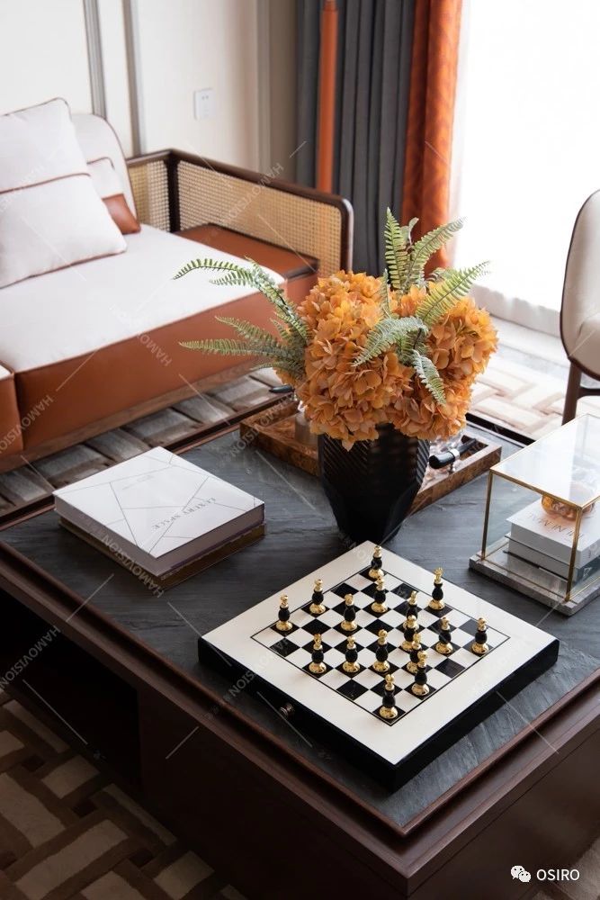 客厅重点突显家具品质在空间中的重要性,橙色的皮艺软包东营沙发是整个空间不安份的元素,造型舒展, 仿佛向人发出邀请,落座瞬间,又有一种被温暖环抱,拥有自己一片独立私密的小天地的体验。