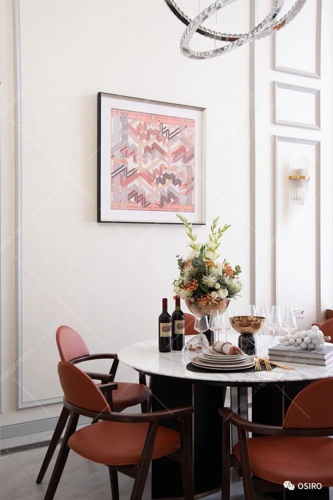 青岛东营空间设计以橙色为主色调开启了“摩登”艺术之旅,由HERMES丝巾装裱而成艺术挂画流畅大气, 一抹橙色激活墙面的生活气息,别致的家具也处处透着主人的身份与生活品质。“大礼不辞小让”,
