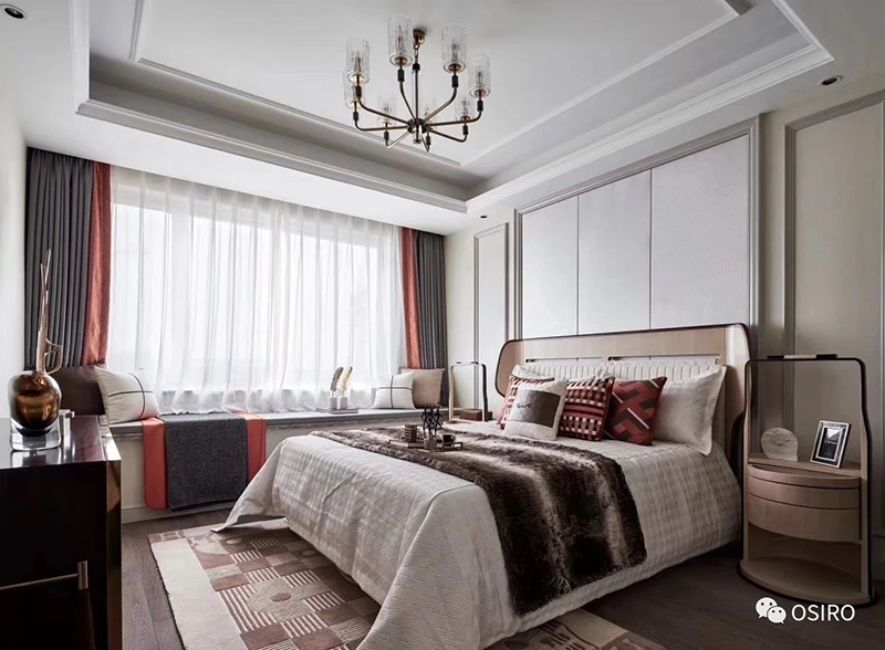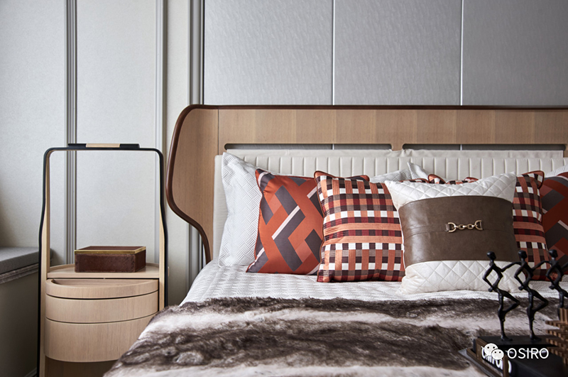 主卧以沉着的灰色调主导的空间转向当代极简主义,垂坠至眼前的吊灯、