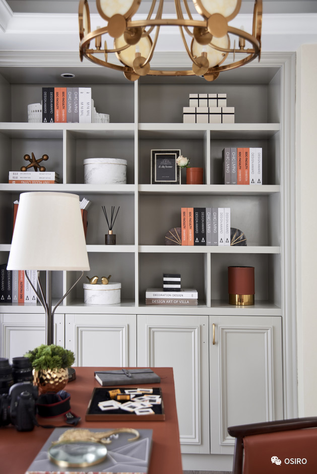 书房在细节处理上,书桌毛皮的大量运用,高耸的书架,