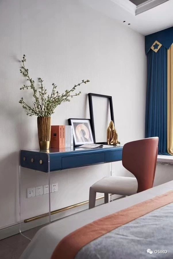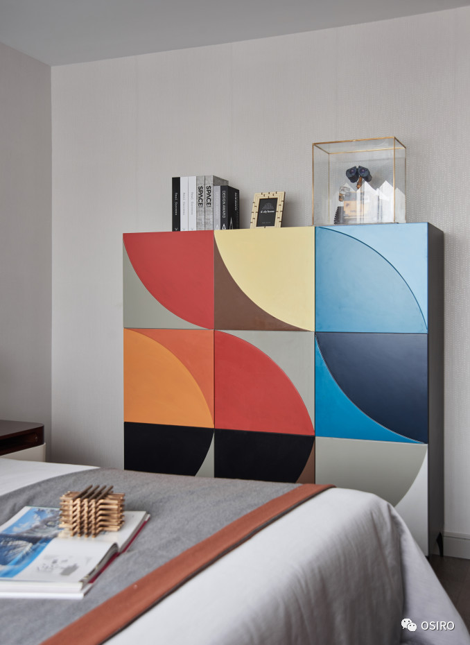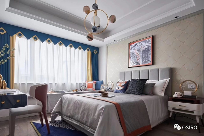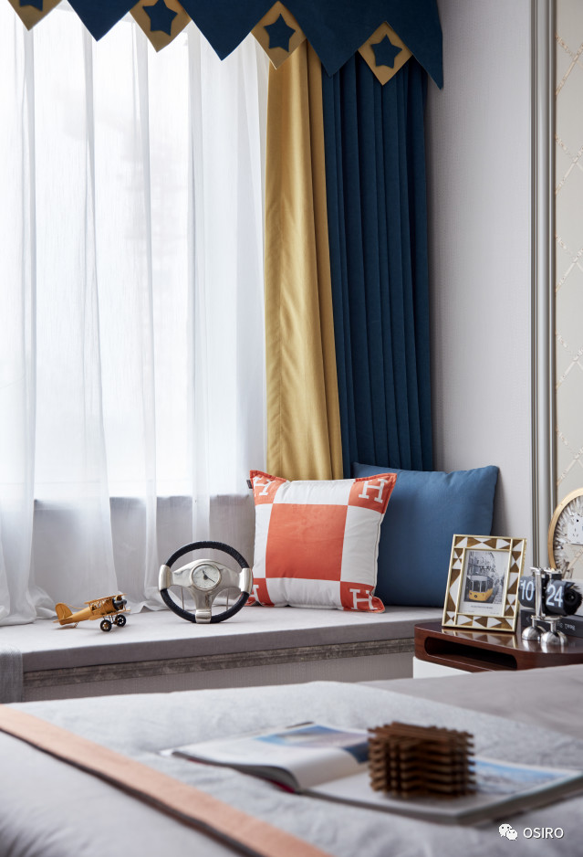 儿童空间自由充满趣味,以灰色蓝橙为主色调的家具、床品突显了当代主义的整体基调,